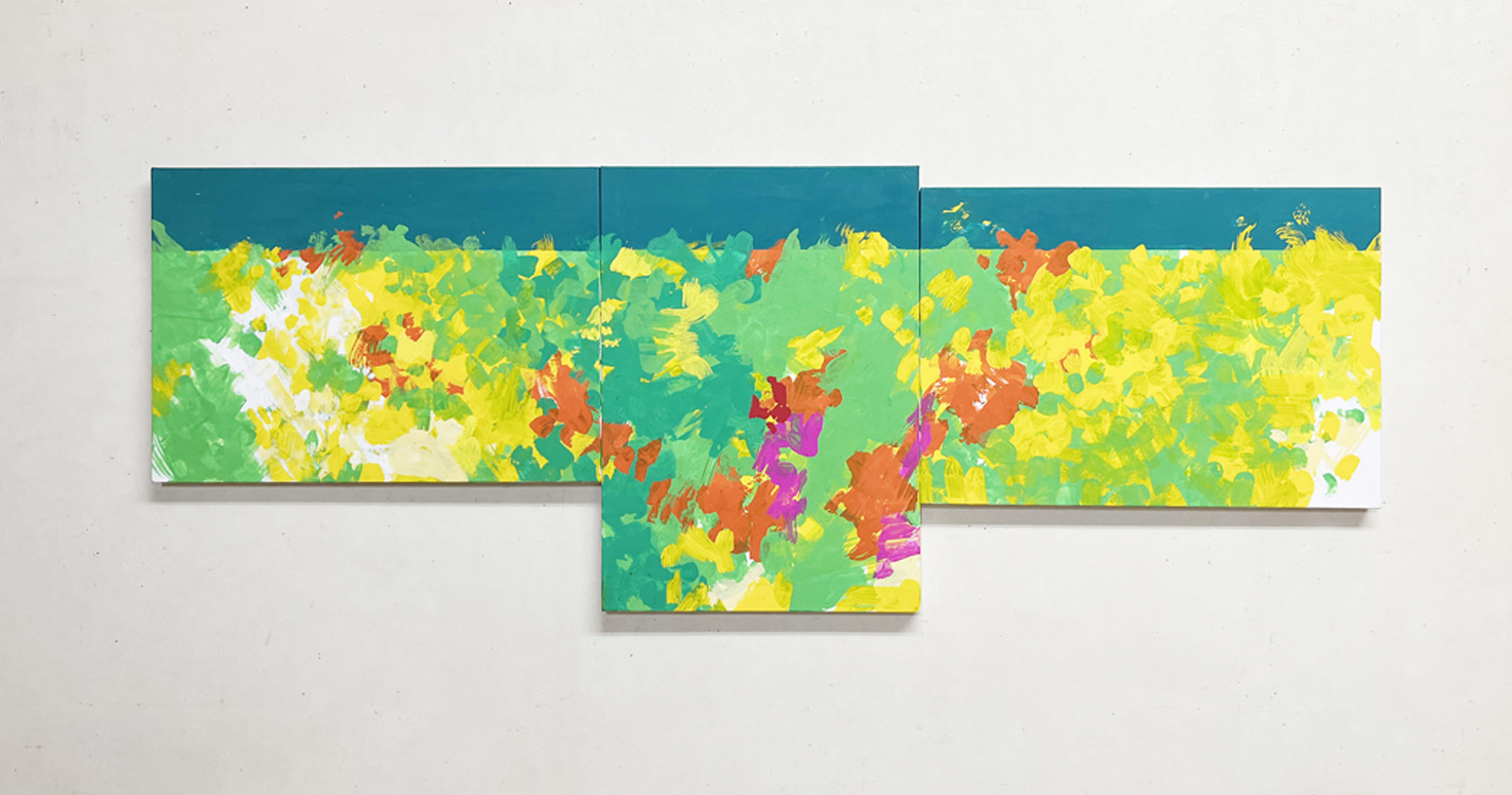 近年は赤や緑などの透明色を用いたモノトーンの平面作品を制作しています